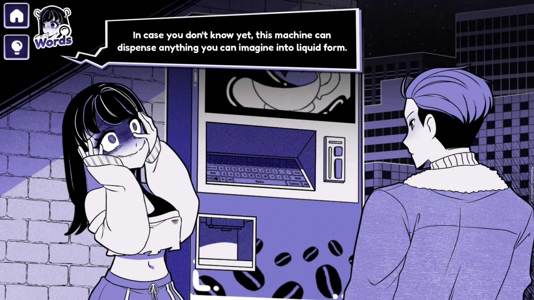 Anomalous Coffee Machine 2 is a strange interactive visual novel and fictional simulation where you stand across from a mysterious girl and a coffee vending machine that can produce anything you type. She doesn’t tell you who she is, why she’s there, or what the deal is with the machine. All she asks is that you type a word—any word—and press the button.