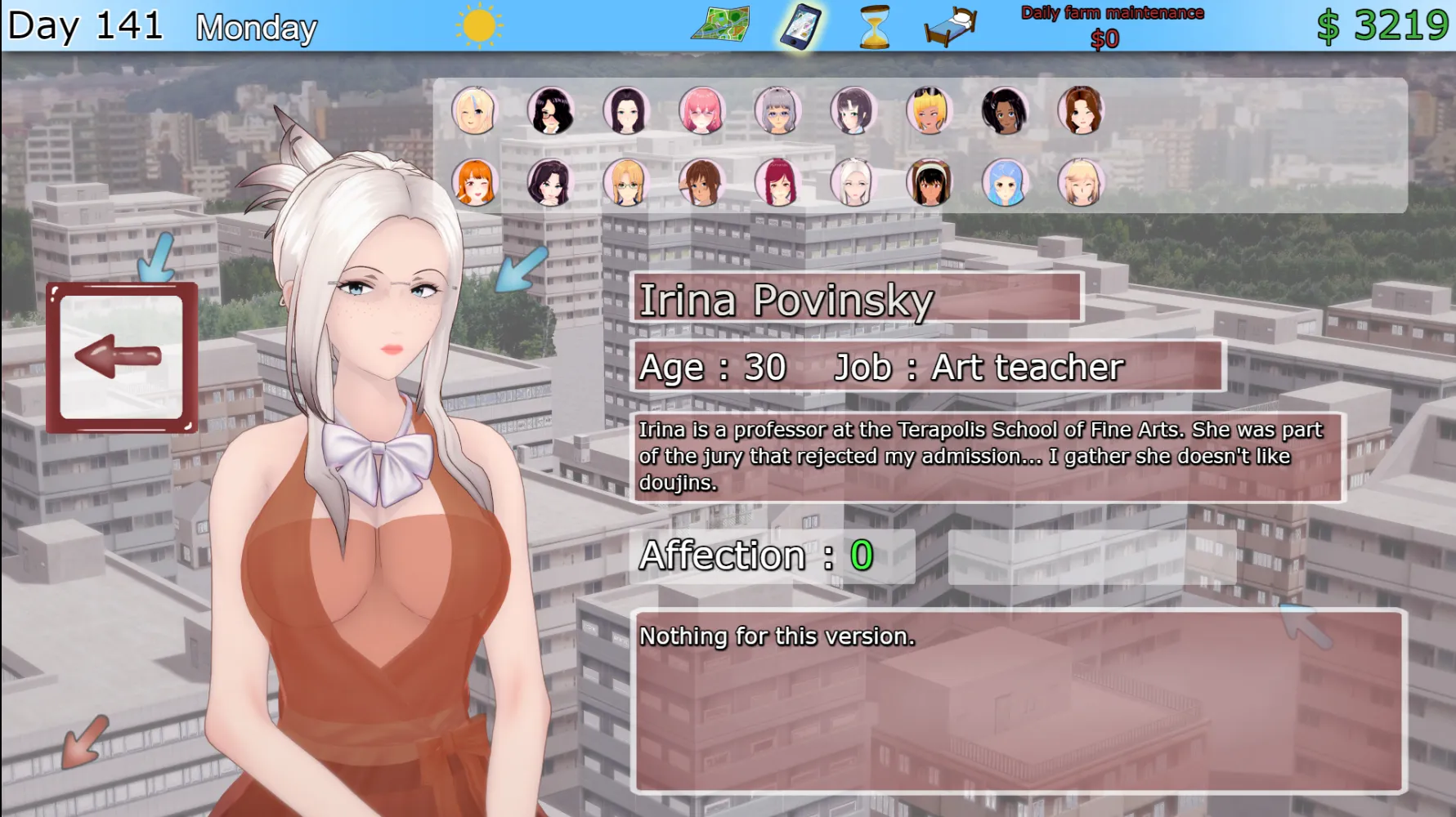 Please take into account that the developer (me) no longer wishes to adapt the game for Mac and Linux (it doesn't work, and for now, I don't have the time to fix that). I will first focus on ensuring the game runs smoothly as it was launched, but I will soon turn to adding a character that will provide a new feature I believe will be greatly appreciated: a medium, which will allow either resetting a character's progression or accessing missed scenes (thus avoiding having to replay the entire game). Alongside this addition, I will try to add animated content for a secondary character among Karen, Halley, or Nora. Since the game's launch is a bit less stable than expected, I will post a unique link to the very latest version here, which will hopefully fix any issues encountered. Once the build is entirely playable without major problems (meaning it doesn't completely block the player), I'll switch to less frequent and more stable updates.